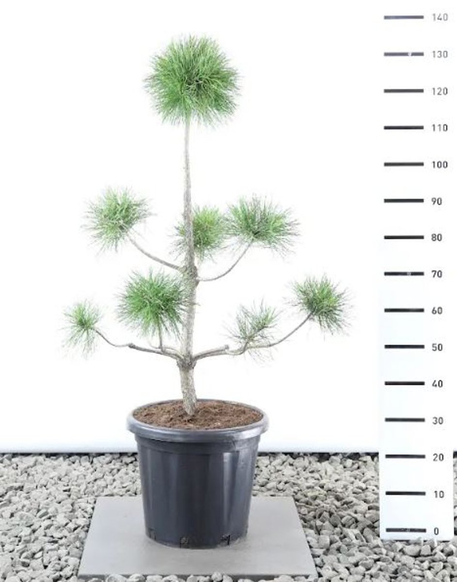 Robust, opprett konifer. Først pyramidal, senere med en mer eller mindre parasollformet og åpen krone. Høyde cirka 10 m. Nålene er lange og mørkegrønne, litt vridd. Hengende kongler. Egnet for tørr jord.