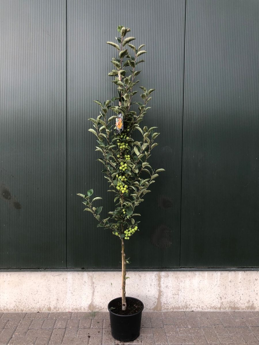 Kraftig, bladfellende busk til lite tre. Høyde cirka 4 - 6 m. Friskgrønt blad. Blomsterknoppen er lillarosa. Blomstene er hvite. Riktblomstrende. April - mai. Sol. Mange store, dypgule prydepler på ettersommeren. Helst næringsrik jord.