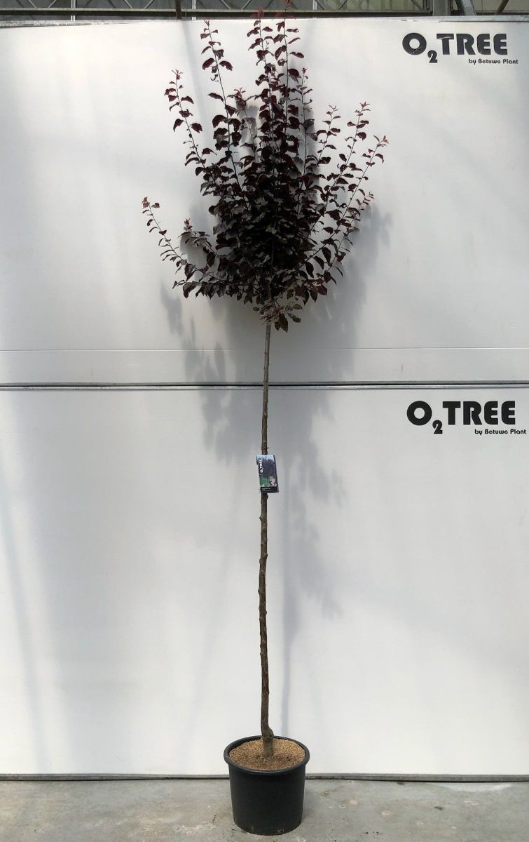 Kraftig busk til lite tre. Høyde 4 - 6 m. Unge kvister er mørkerøde. Rødbrunt blad gjennom hele sesongen. Små, rosa blomster i mars - april. Meget riktblomstrende. Solrikt voksested. Fruktbar jord.