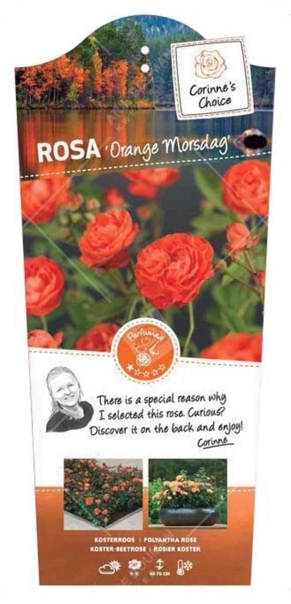 En lav buskrose med små, fylte oransjegule blomster i store klaser. Overdådig blomstring fra juni til ut i oktober. Høyde cirka 45 cm. Kompakt voksende. Svært sunn. Solrikt voksested.