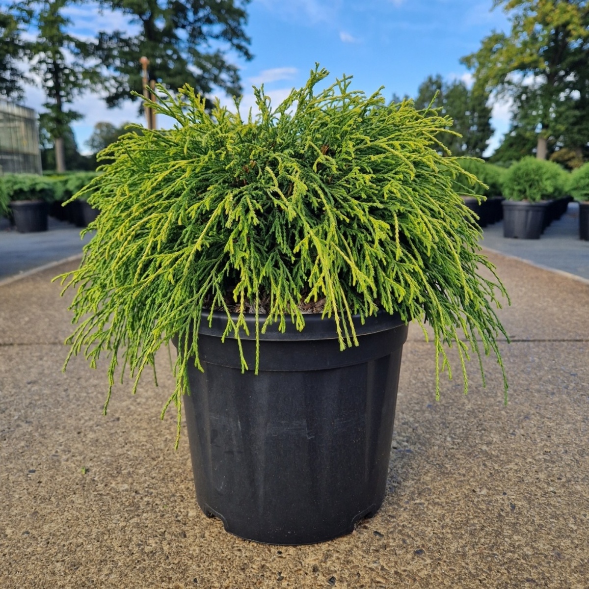 Løst voksende konifer med hengende, trådaktige grener. Kuleformet, litt konisk voksemåte. Vokser langsomt. Høyde inntil 1 m. Klart gult løv. Lyst voksested. Humusrik jord. Dekorativt solitærtre.