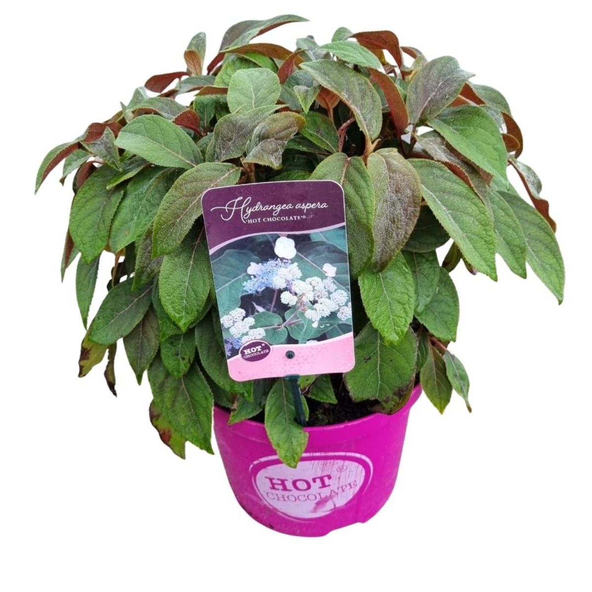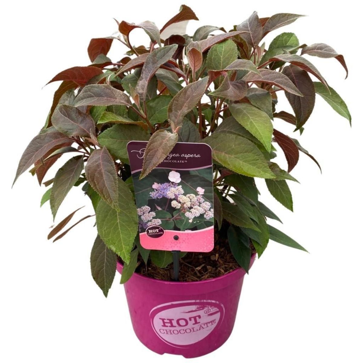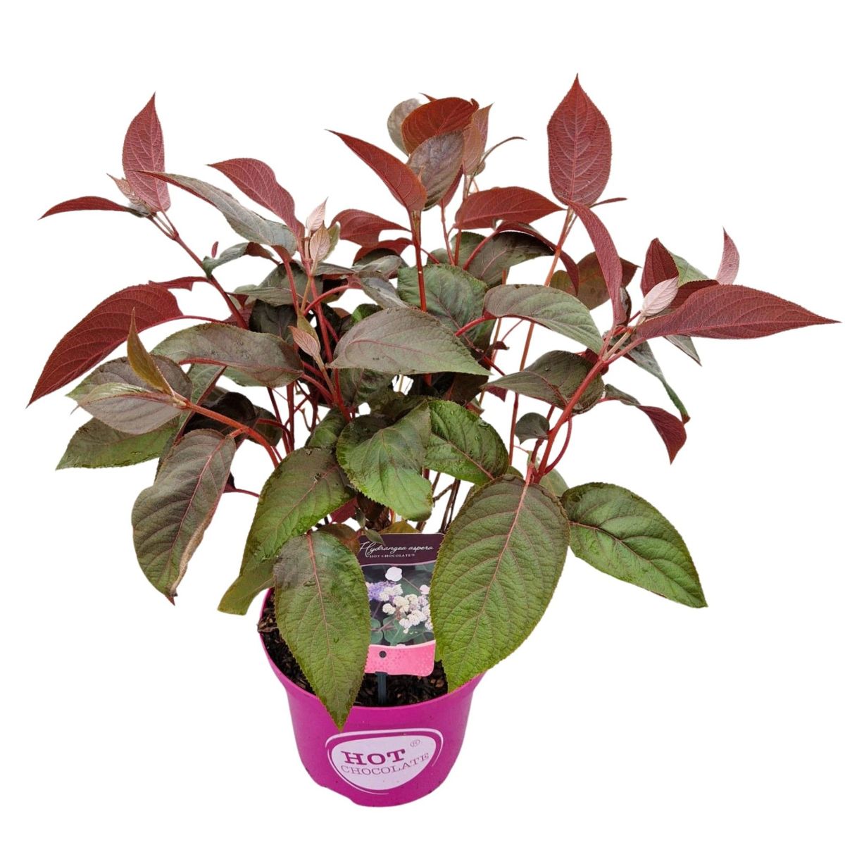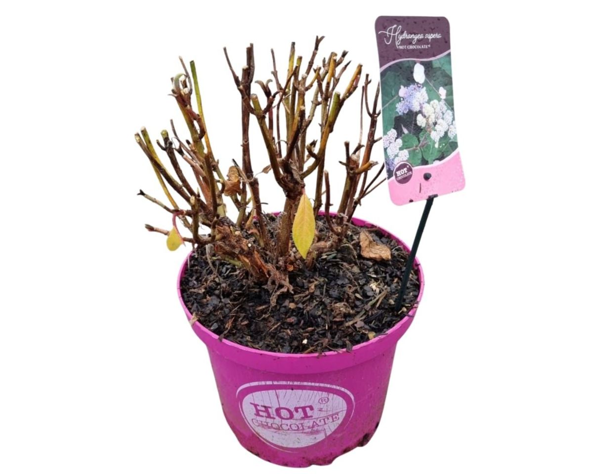 En kompakt hortensia med unike, sjokoladebrune blader som blir røde om høsten. Blomstrer om sommeren med kremhvite til rosa blomster. Vokser opptil ca. 1,2 meter, vinterhardfør og egnet for hage eller potte. Trives i halvskygge og fuktig, godt drenert jord.