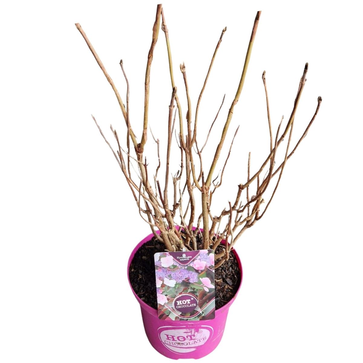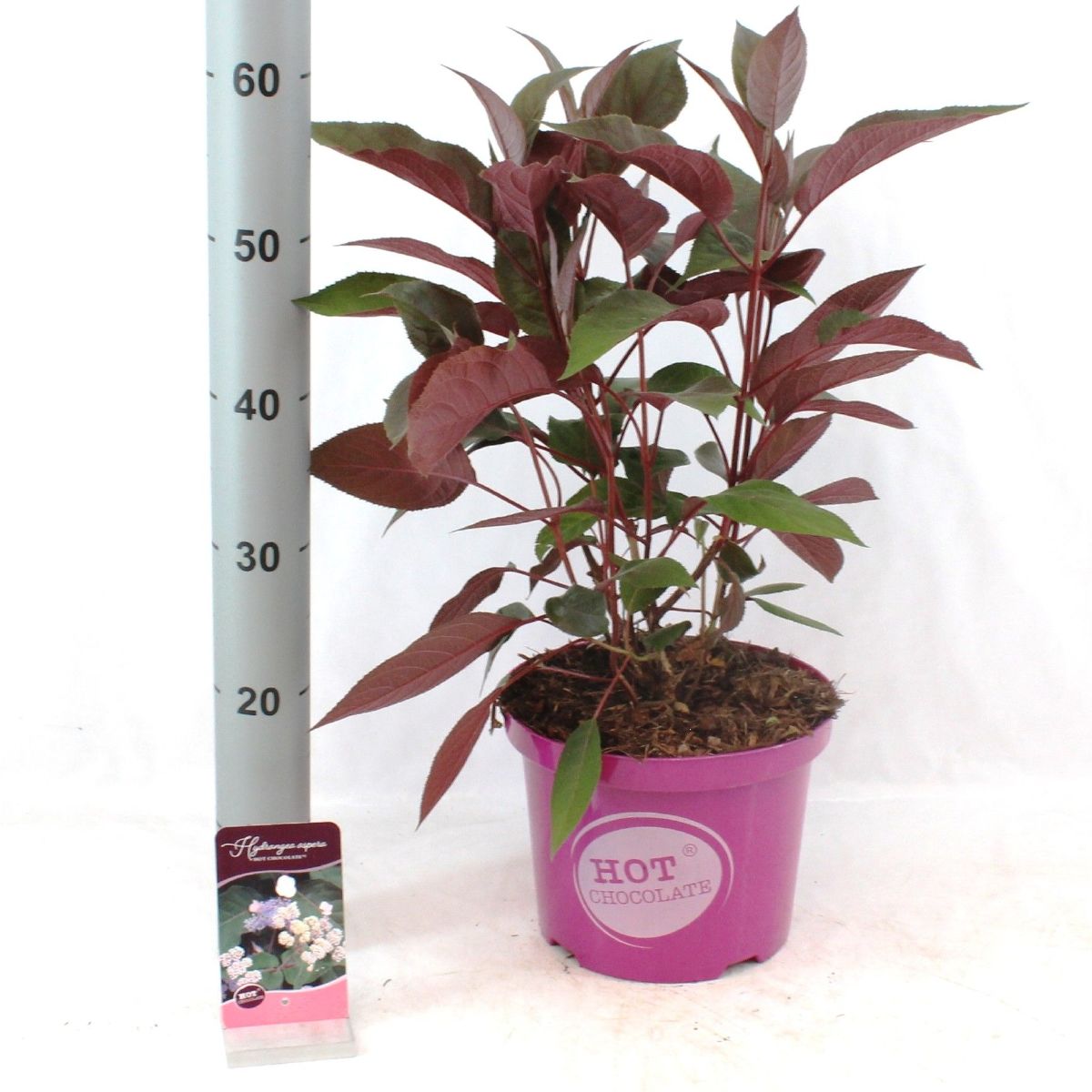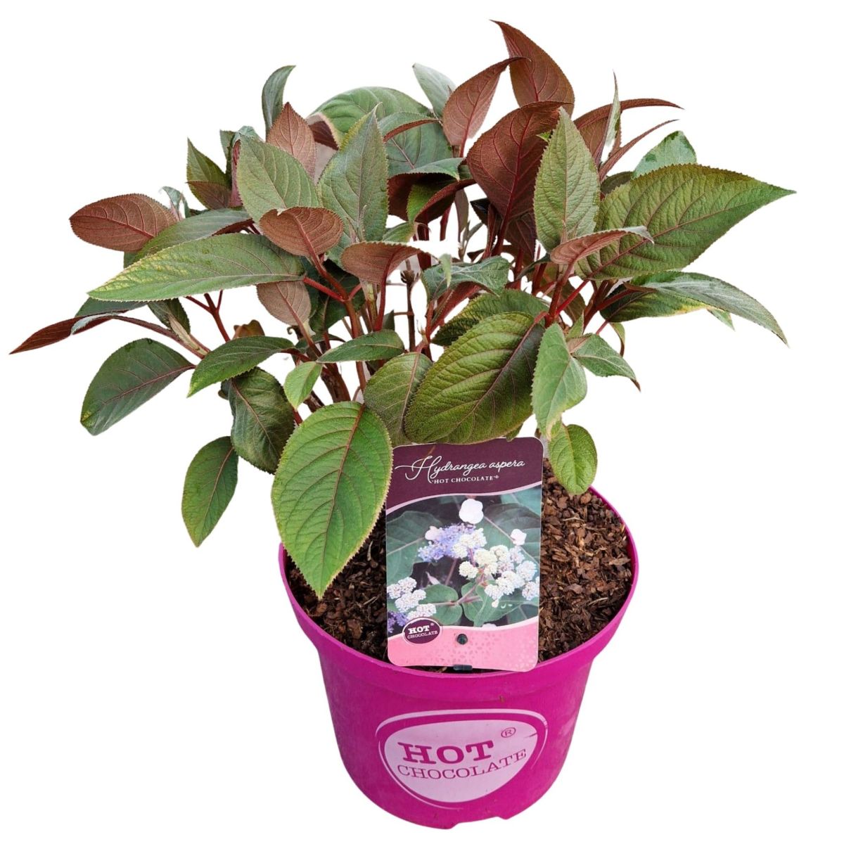 En kompakt hortensia med unike, sjokoladebrune blader som blir røde om høsten. Blomstrer om sommeren med kremhvite til rosa blomster. Vokser opptil ca. 1,2 meter, vinterhardfør og egnet for hage eller potte. Trives i halvskygge og fuktig, godt drenert jord.