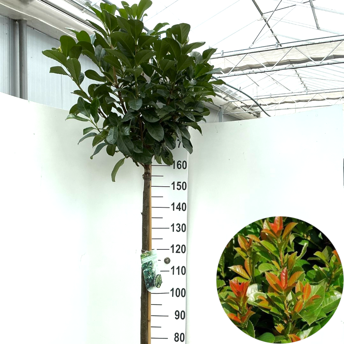 Kraftig, vintergrønn busk med høyde på inntil vel 2 m. Tåler beskjæring uvanlig godt. Bladene er læraktige, glinsende grønne og smale. Ungt løv er brunrødt. Hvite blomster i opprette klaser. Tåler skygge. Lunt voksested.