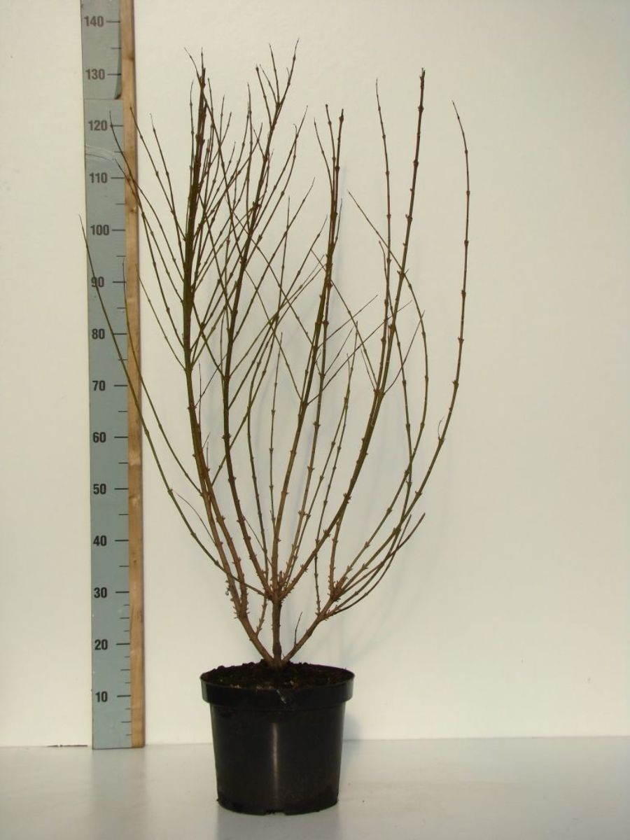 Bladfellende busk med kraftig opprette grener. Høyde cirka 1,5 m. Blomstrer svært rikt før bladene kommer. Blomstene er gyldengule. Mars - april. Krever et lyst voksested. Etter blomstringen beskjæres noen gamle grener.